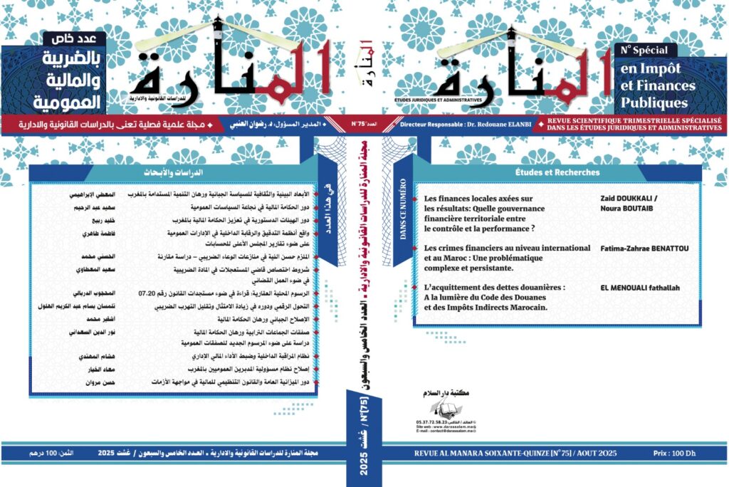 يسر مجلة المنارة للدراسات القانونية والإدارية أن تضع بين يدي قرائها الاكارم -وضمن سلسلة الاعداد الخاص- العدد الخامس والسبعون في موضوع : “الضريبة والمالية العمومية “، انه يشكل بحق منارة تضيء دروب الباحثين والمتخصصين وتنير سبيلهم . واطلالة حاولنا من خلالها إضافة بحوثا جديدة في هذا النوع من التخصص القانوني .