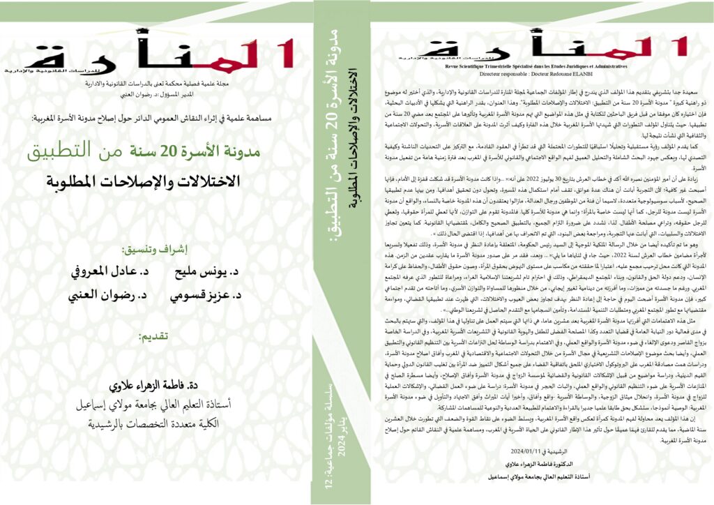 سعيدة جدا بتشريفي بتقديم هذا المؤلف الذي يندرج في إطار المؤلفات الجماعية لمجلة المنارة للدراسات القانونية والإدارية، والذي أختير له موضوع ذو راهنية كبيرة ” مدونة الأسرة 20 سنة من التطبيق: الاختلالات والإصلاحات المطلوبة”. وهذا العنوان، بقدر الراهنية التي يشكلها في الأدبيات البحثية، فإن اختياره كان موفقا من قبل فريق الباحثين للكتابة في مثل هذه المواضيع التي تهم مدونة الأسرة المغربية وتأثيرها على المجتمع بعد مضي 20 سنة من تطبيقها. حيث يتناول المؤلف التطورات التي شهدتها الأسرة المغربية خلال هذه الفترة وكيف أثرت المدونة على العلاقات الأسرية، والتحولات الاجتماعية والثقافية التي نشأت نتيجة لها.